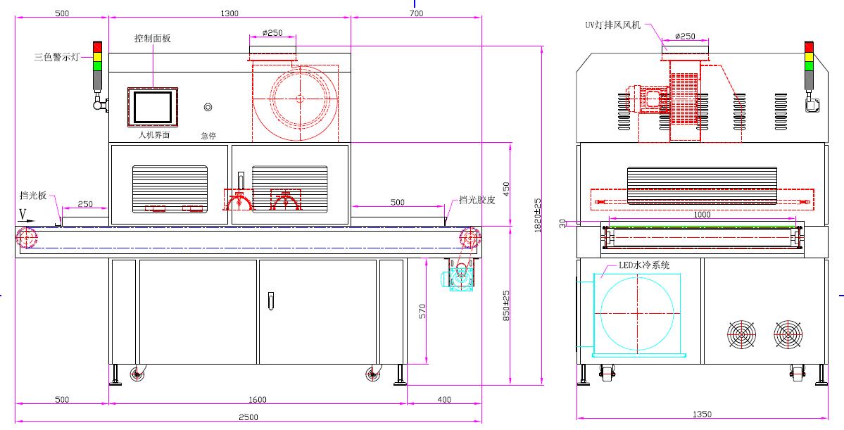 | 1、UV光源:LED*2組、UV汞燈12kw*2組 | 2、UV汞燈總長(zhǎng):llOOmm、弧長(zhǎng)1000mm |
